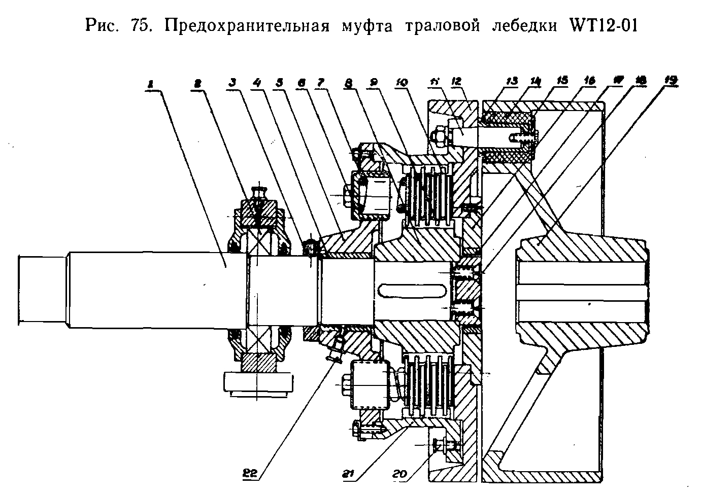 Пружины 7 зажимают с такой силой, чтобы максимальный момент, передаваемый муфтой, равнялся 690 кГм, что составляет 1,6 номинального момента. Это предохраняет электродвигатель и лебедку от перегрузок при выбирании ваера. Внутренняя полость корпуса 21 всегда наполнена смазкой, подаваемой масленкой 20. С помощью масленки 20 смазывается и отверстие втулки 17. Максимально допустимый бой, замеряемый на внешней поверхности муфты сцепления, не должен превышать 0,25 мм.